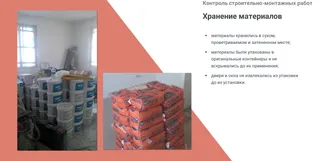 Хранение материалов материалы хранились в сухом, проветриваемом и затененном месте; материалы были упакованы в оригинальные контейнеры и не вскрывались до их применения; двери и окна не извлекались из упаковки до их установки.