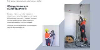 Обеспыливание Во время отделочных работ образуется строительная пыль. Он представляет угрозу для здоровья персонала и будущих жильцов, поэтому крайне важно принять меры по предотвращению её распространения. Поверхности стен и потолков были обработаны промышленным пылесосом для удаления пыли.