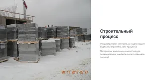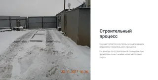 Строительный процесс Осуществляется контроль за надлежащим ведением строительного процесса. Материалы, хранящиеся на площадях складирования, накрыты полиэтиленовой пленкой.