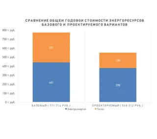 Результаты энергомоделирования Основная экономия средств на энергетические ресурсы была достигнута благодаря более эффективному использованию тепловых ресурсов. Далее рассмотрим решения, которые помогли достичь такой экономии.