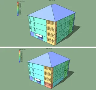 Результаты энергомоделирования Благодаря улучшенным теплотехническим свойствам ограждающих конструкций общие теплопотери здания значительно снизились Также снизились общие теплопоступления в помещения от солнечной радиации. Они визуализированы для Базового (сверху) и Проектного (снизу) зданий.