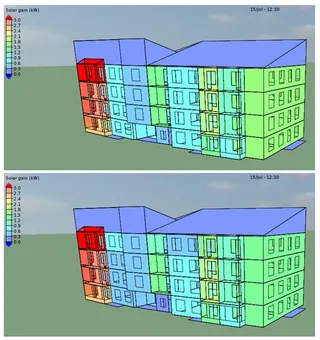 Результаты энергомоделирования Благодаря улучшенным теплотехническим свойствам ограждающих конструкций общие теплопотери здания значительно снизились Также снизились общие теплопоступления в помещения от солнечной радиации. Они визуализированы для Базового (сверху) и Проектного (снизу) зданий.