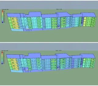 Благодаря улучшенным теплотехническим свойствам ограждающих конструкций общие теплопотери здания значительно снизились Также снизились общие теплопоступления в помещения от солнечной радиации. Они визуализированы для Базового (сверху) и Проектного (снизу) зданий.