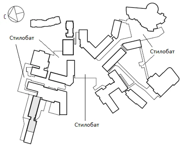 Стилобат представляет собой двухуровневое подземное сооружение с надземной, 3-х этажной встроено/пристроенной административной частью. Функциональная особенность стилобата заключается в объединении всех элементов инфраструктуры курорта. Его конструкция предполагает размещение на подземных этажах транспортных и пешеходных галерей, которые связывают в единую сеть отели, конгресс-центр и спа-центр. Благодаря такому решению весь транспорт, погрузка-разгрузка, иные технологические процессы можно проводить под землей и не нарушать отдых туристов, а также не зависеть от погодных условий, что немаловажно в условиях снежного климата Камчатки. Для посетителей курорта также предусмотрены пешеходные галереи между зданиями, что повышает комфорт перемещения в плохую погоду.