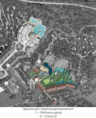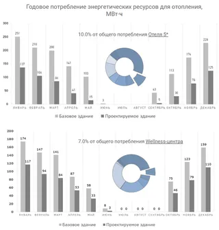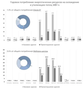 На территории объектов туристской индустрии, как правило, размещается множество зданий различного назначения. Энергомоделирование помогает оптимизировать энергопотребление каждого здания в отдельности и добиться повышения энергосбережения, а, следовательно, сократить необоснованные эксплуатационные затраты при функционировании объекта в целом. Рассмотрим результаты на примере двух зданий: Оздоровительно-реабилитационного комплекса и Отеля 5*.
