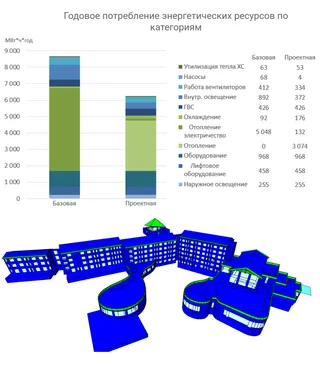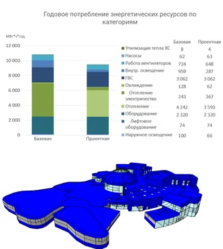 Энергомоделирование – инструмент, позволяющий оценить энергетическую эффективность объекта. В процессе моделирования строятся Базовая и Проектная модели: задается геометрия, окружающая застройка, нагрузки от людей, оборудования и освещения, параметры ограждающих конструкций и инженерных систем, погодные данные. Проектная модель строится по проектной документации с учетом внедренных энергоэффективных мероприятий, а Базовая – с учетом минимальных нормативных требований. На финальном этапе производится моделирование годового энергопотребления здания и его анализ с декомпозицией по разным инженерным системам. Результатом является сравнение энергопотребления в Базовой и Проектной моделях и, собственно, показатель энергоэффективности здания в числовом и процентном выражении.