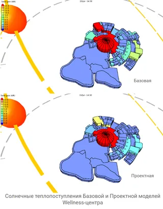 На изображении показаны солнечные теплопоступления Базовой и Проектной моделей оздоровительного комплекса на дату 15 июля в полдень. Они отличаются – в Проектной модели в помещения попадает меньше солнечной радиации, поскольку коэффициент пропускания солнечной энергии проектируемого здания более чем в 2 раза ниже базового значения. Это приводит к сокращению потребности в охлаждении помещений.