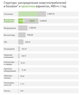 Энергоэффективность в освещении Внутреннее освещение — второй по значимости источник в энергопотреблении технопарка. применение энергосберегающих светодиодных светильников, позволяющее сократить потребление энергии.
