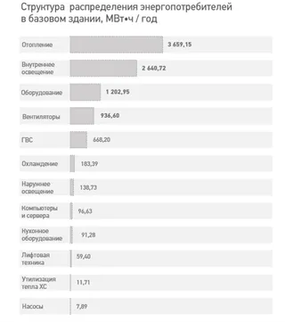 Базовый вариант Здание промышленного технопарка, построенное по базовым нормативам, демонстрирует следующую структуру годовых энергозатрат. Крупнейшими потребителями в базовом варианте являются следующие инженерные системы: отопление; внутреннее освещение; оборудование; вентиляторы. Именно на эти системы следует сосредоточить основные усилия для повышения энергоэффективности и энергосбережения.