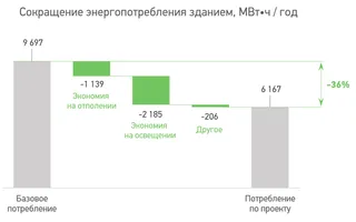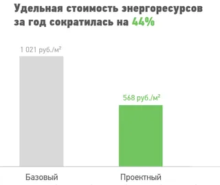 Энергоэффективность – основа устойчивого развития больших проектов Благодаря реализованным мерам удельные затраты на энергоресурсы в промышленном технопарке сократились с 1 021 руб./м2 до 568 руб./м2, что на 44% ниже по сравнению с расходами в обычных нормативных объектах.