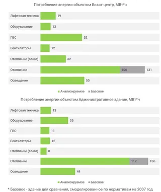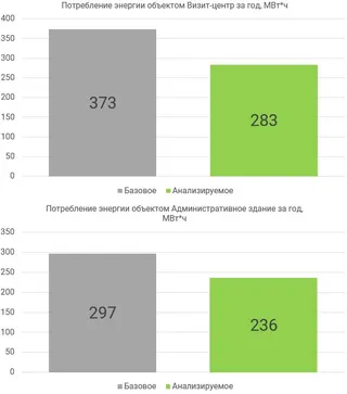 Общие результаты моделирования Когда энергетическая модель готова, программа моделирует жизненный цикл объекта за один год. В результате мы узнаем, сколько энергии удалось сэкономить благодаря применению энергоэффективных решений. С помощью энергетического моделирования удалось выяснить, что в рассматриваемых объектах, визит-центр и административное здание, энергоэффективные решения экономят 89 МВт*ч и 61 МВт*ч соответственно. В относительных единицах - это 24% и 20% .