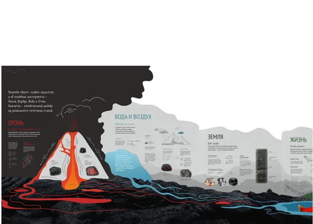 На первом этаже визит-центра размещается приковывающая взгляд зона «Философия местности». Здесь объединились все стихии природы, и каждый может не только узнать что-то из истории Кроноцкого заповедника и Камчатского края, но даже увидеть и услышать обитателей разных стихий. Можно даже прикоснуться к настоящему вулкану и заглянуть внутрь, а также понять, что такое «Пятый элемент». Так создатели экспозиции сделали знакомство с Камчатским краем доступным для каждого человека.