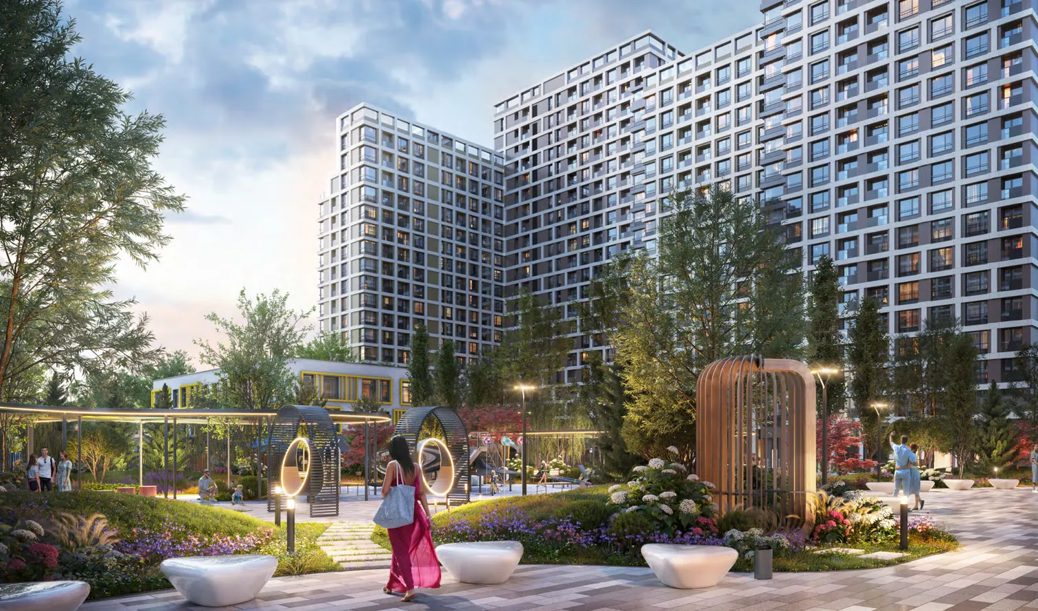 Ландшафтная концепция основана в гармонии с окружающей природой. На территории предусмотрено несколько прогулочных маршрутов, пространства для игр, спортивные площадки для разных возрастов, места для уединенного отдыха. Для озеленения территории подбирались преимущественно адаптивные к местному климату растения. Для повышения водоэффективности была разработана система сбора дождевой воды для возможности организации требуемого дополнительного полива в засушливое время года. Также вдоль одного из маршрутов на территории было предусмотрено обустройство дождевого сада с высаженными влаголюбивыми растениями.
