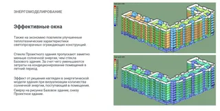 Также на экономию повлияли улучшенные теплотехнические характеристики светопрозрачных ограждающих конструкций. Стекла Проектного здания пропускают заметно меньше солнечной энергии, чем стекла Базового здания. За счет чего уменьшаются затраты на кондиционирование помещений в летний период. Эффект от решения нагляден в энергетической модели здания при визуализации количества солнечной энергии, поступающей в помещения. Сверху на рисунке Базовое здание, снизу Проектное здание.