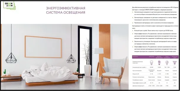 В целях эффективного использования воды питьевого качества для жильцов дома были разработаны рекомендации по подбору водосберегающих приборов и техники. В местах общего пользования и подземном паркинге установлены датчики движения и светодиодные лампы, снижающие затраченную энергию на освещение. Отопительные приборы в помещениях оборудованы автоматическим терморегулятором, позволяющим настроить теплоотдачу в зависимости от потребностей. В административных помещениях применены приточно-вытяжные установки с эффективностью рекуперации тепла более 70%.