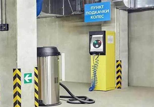 В подземном паркинге установлена собственная станция подкачки колес. Как известно, давление в шинах может падать со временем или из-за скачков температур наружного воздуха. Жильцы могут проверить давление в шинах, и если оно низкое, это можно быстро исправить прямо на месте.