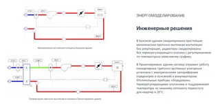 В Базовом здании смоделирована простейшая механическая приточно-вытяжная вентиляция без рекуперации, радиаторы смоделированы без терморегулирующего клапана с регулированием по температурно-зависимому графику. В Проектируемом здании система отражает работу поквартирных приточно-вытяжных установок с электрическими калориферами (преднагрев и основной) и рекуператором. Отопительные приборы оборудованы терморегулирующими клапанами и поддерживают температуру по нижнему сетпойнту термостата для квартир в 20°C.