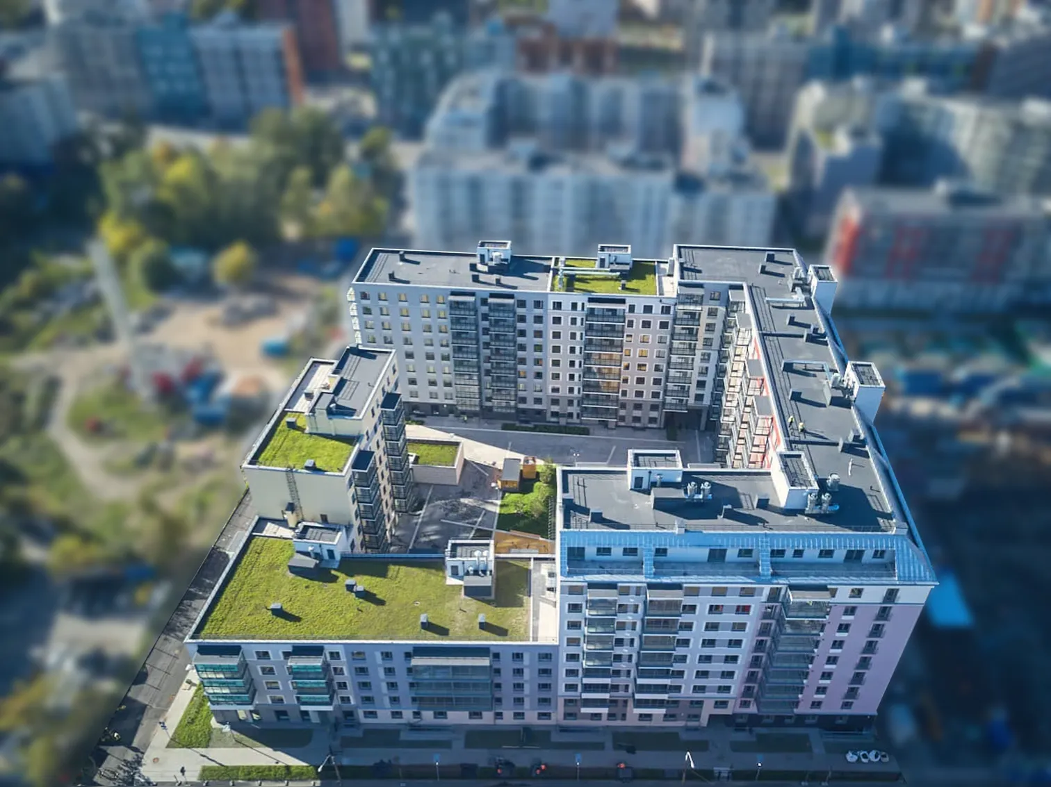 Вместо асфальта в благоустройстве применяется тротуарная плитка. Отсутствие асфальта на территории жилого комплекса снижает эффект городского острова тепла. В результате уменьшается нагрев воздуха на уровне земли, что приводит к снижению температуры и созданию более комфортных условий для жителей.
