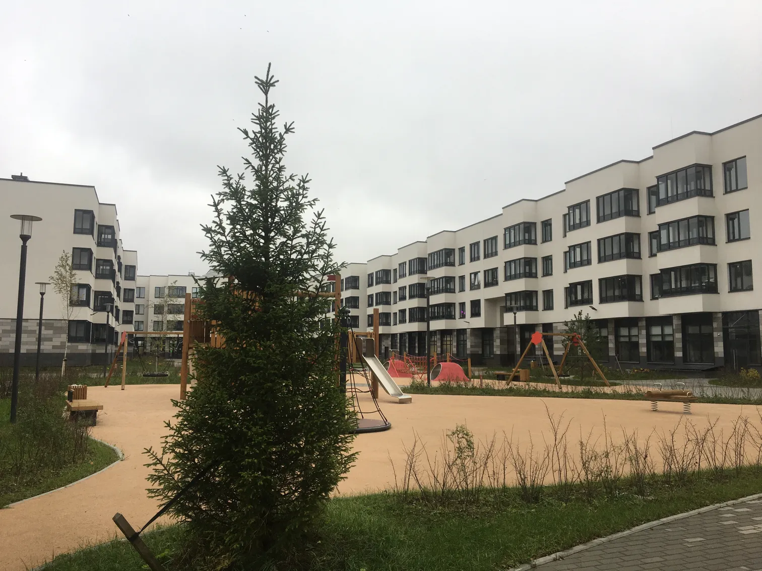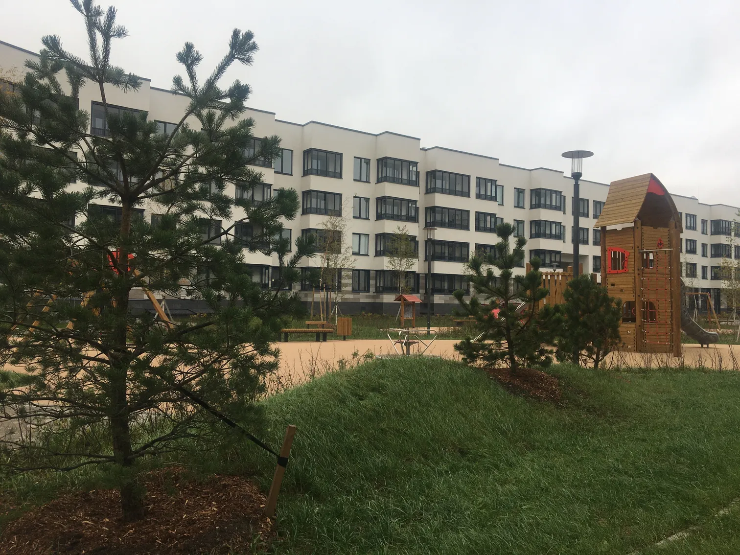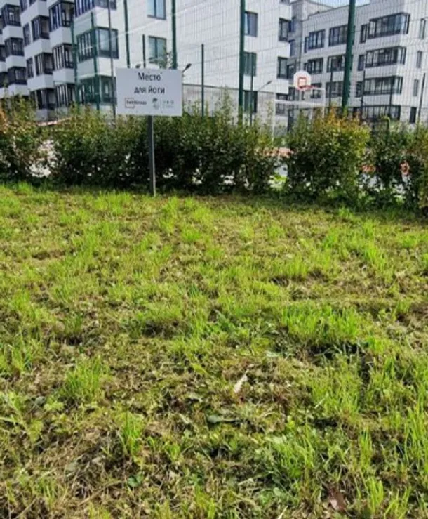 На территории жилого комплекса организованы зоны для практики йоги в теплое время года. Площадки огорожены кустарником и засеяны газонной травой, что позволяет проводить занятия как на коврике, так и босиком.